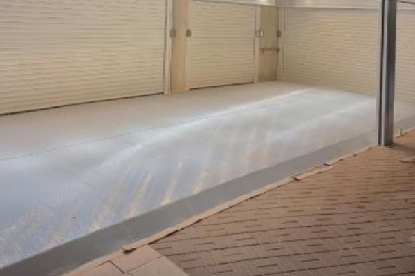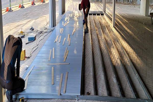 데크 플레이트를 한장,한장 좌우로 펼쳐가면서 시공하며, 시공 후 끝부분은 앤드자재로 마감.