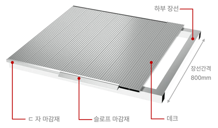 120mm 데크 플레이트는 방부목이나 합성목재와 동일하게 시공하지만 장선의 간격이 다름.