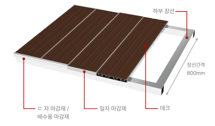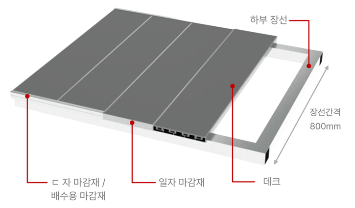 설치시간을 좀 더 단축하고, 데크커버에 배수기능을 돕는 홈구간 적용으로